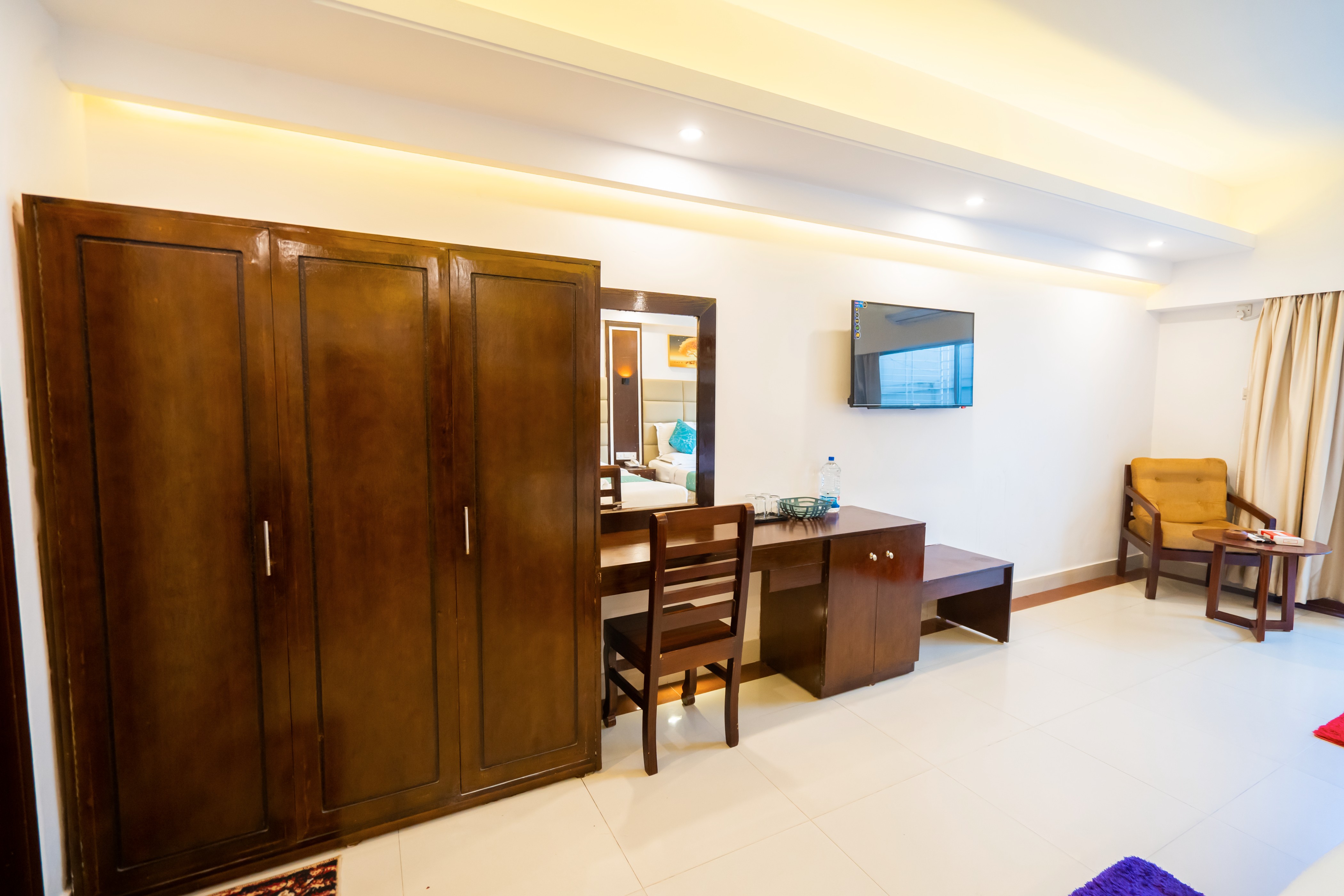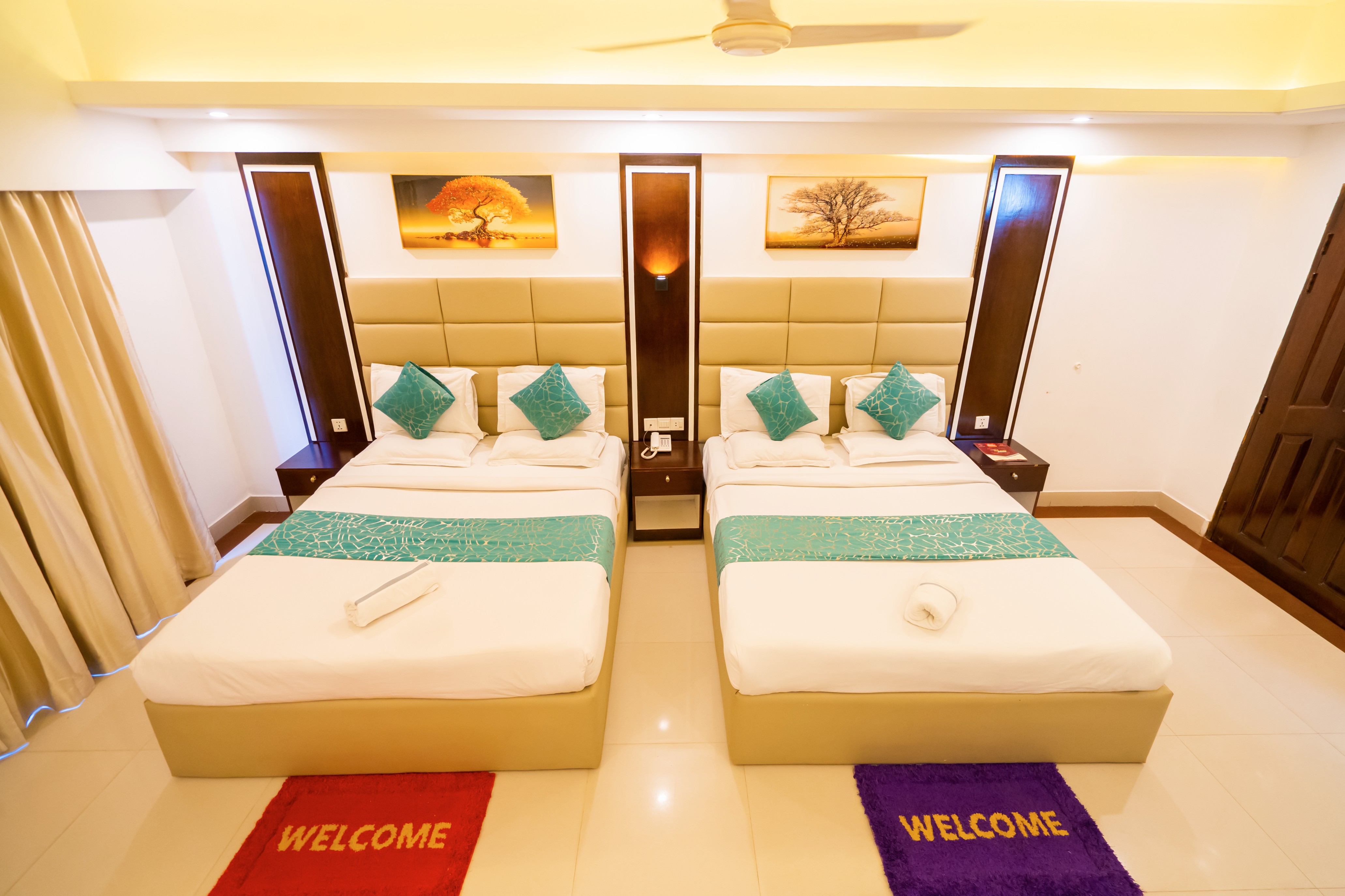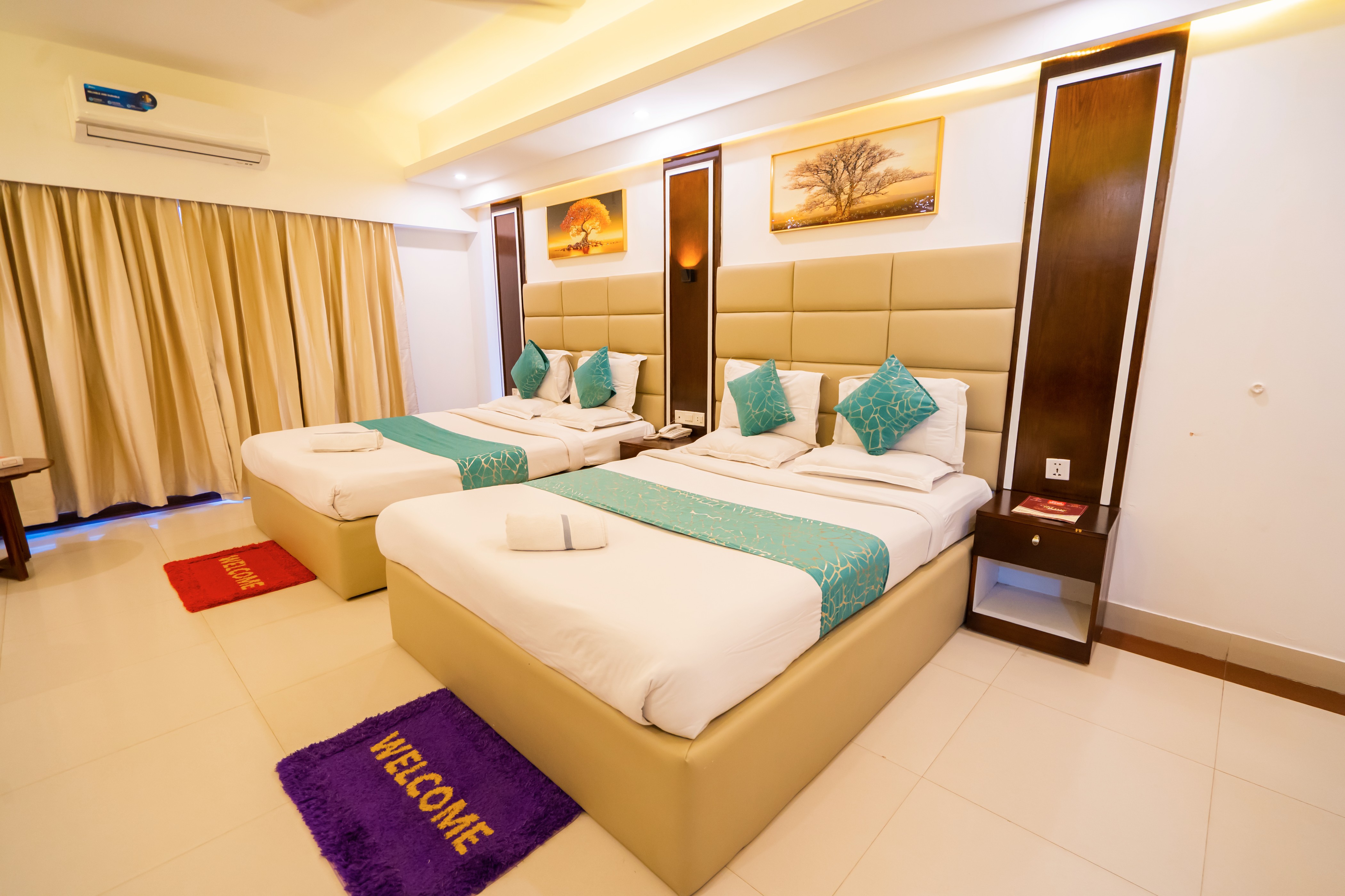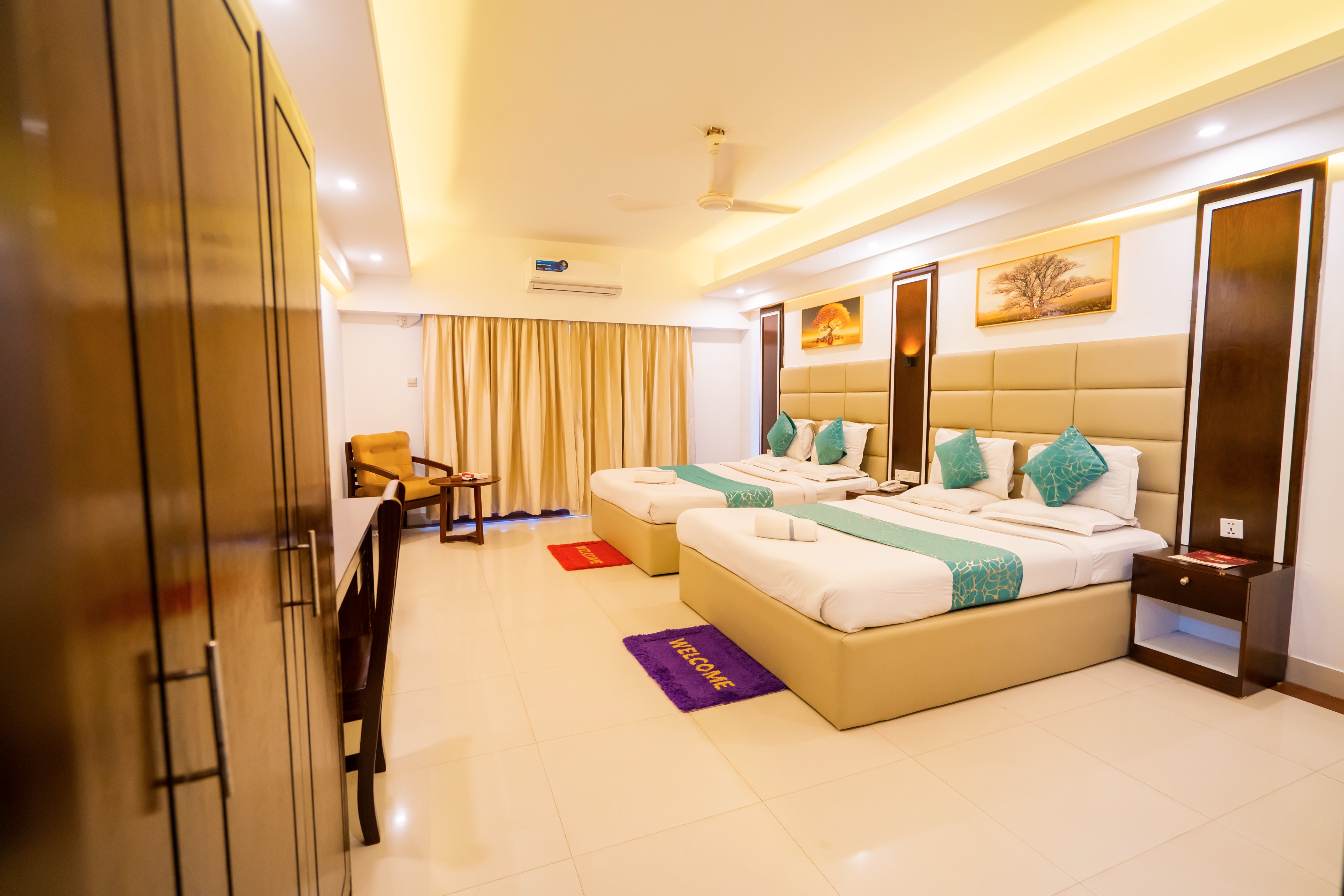 Our "Deluxe Four Bed" Rooms are great for Friends, Colleagues, and Family. This room has Two King size beds, a private big balcony, and one private room with One Bathroom. Every room has an AC, Geyser, TV, Wi-Fi, Telephone, Work desk with chair, sofa & Big size Cabinet.